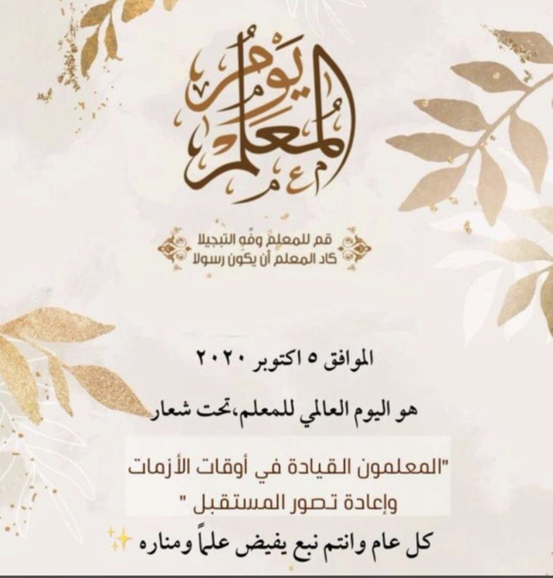 - في هذا اليوم الخامس من أكتوبر نحتفل بيوم المعلم، لنضيء شمعة تقدير وإجلال لهذا الشخص الذي قدم لنا الدعم وما بخل علينا بعلمه ووقته وفكره وصبره، وكان لنا خير دليل في مسيرتنا العلمية، شكراً جزيلاً معلمي الغالي، ودمت لنا منارة علم لا تنطفئ.